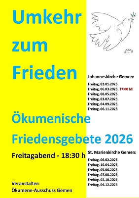 Das Friedensgebet am 06.03. feiern wir zusammen mit dem Weltgebetstag der Frauen um 17..00 Uhr.
